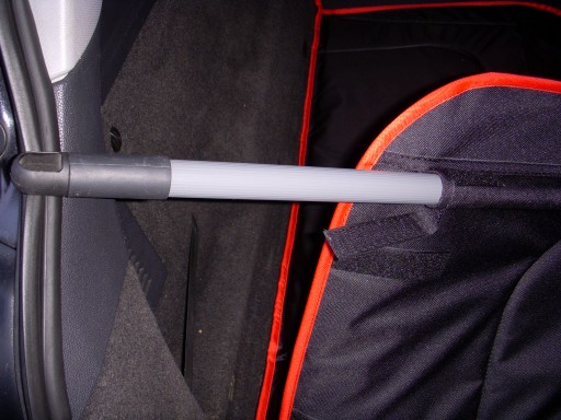 Tylna klapa maty chroni lakier na zderzaku naszego samochodu przed zadrapaniem podczas wsiadania psa czy załadunku towarów, dla usztywnienia posiada wszyty tunel w który można wsunąć element usztywniający np. rurkę PCV ½ cala.